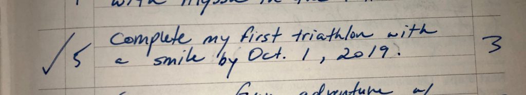 And I repeated a goal I reviewed almost daily all year: “I want to finish my first triathlon with a smile by October 1.”